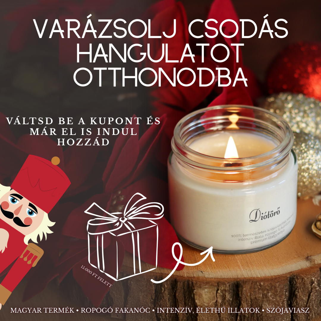 A karácsonyi készülődés az év leghangulatosabb időszaka. Töltsd meg Te is otthonod csodás illatokkal, hogy az otthon töltött idő a lehető leghangulatosabb legyen. Használd ezt a kupont, váltsd be a 15.000 Ft feletti rendelésedhez és ajándékba kapsz egy közönségkedvenc, Diótörő-illatú prémium illatgyertyát.
